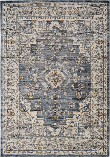 Designfolk fandt Gulvtæppe Loomery Troye Blå Med Medallion Design Gyldne Accenter Slidstærk Polyester 200290 fra Loomery hos likehome