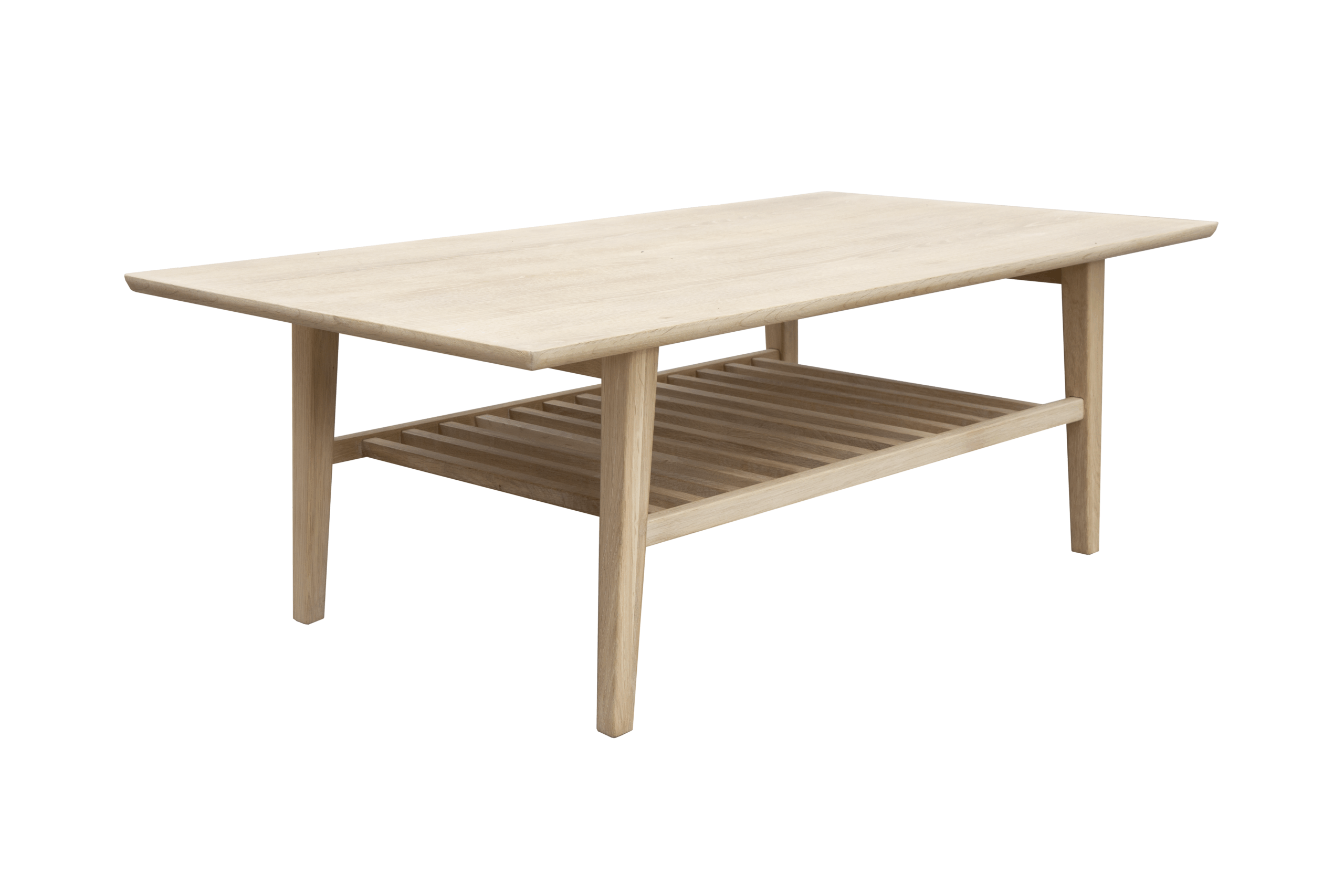 Palermo sofabord med hylde i massiv egetræ. Bordet er købt som restparti, og det er derfor begrænset antal…