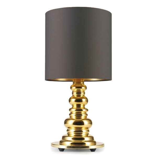 Design By Us Punk DeLuxe bordlampe, nougat. Mundblæst og håndmalet glas i guld, danner basen for denne bordlampe. Skærmen er håndlavet og har en inderskærm i guld. Lampen leveres med en , meter stofledning….