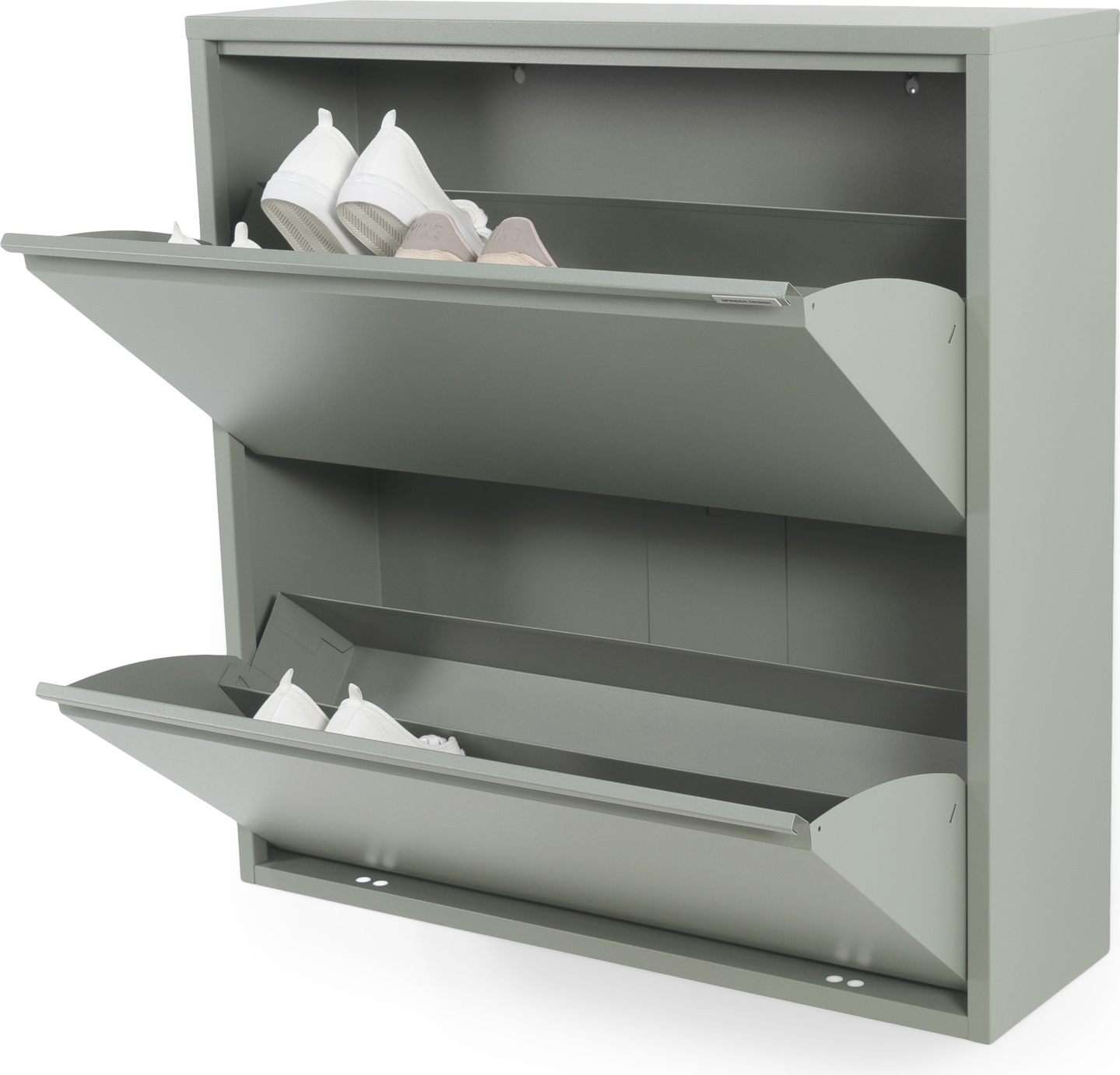 Designfolk fandt Skoskab Spinder Design Billy Støvet Grøn Pulverlakeret Stål Klapdøre Skuffer Plads Til Par 575 fra Spinder Design hos likehome